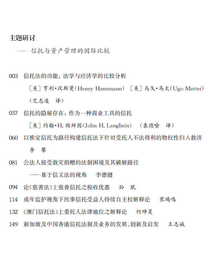 目前已经出版五卷,主题分别聚焦于“民法典视野下的商事问题”、“《中华人民共和国公司法》的修订”、“劳动法体系化的理论与路径”、“商事争端解决机制的比较与借鉴”、“信托与资产管理的国际比较”。期待学术界与实务界的同仁继续向本刊赐稿。