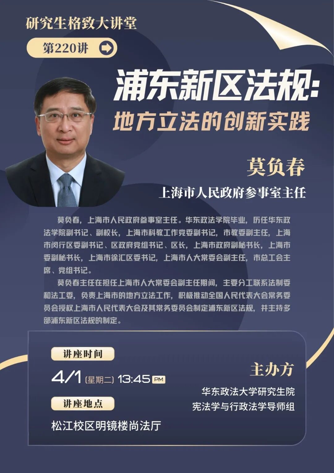 研究生格致大讲堂第220讲 01 讲座主题: 浦东新区法规:地方立法的创新实践 02 讲座时间: 4月1日下午13:45 03 讲座地点: 松江校区明镜楼尚法厅(三百人报告厅) 04 主讲人: 莫负春 上海市人民政府参事室主任 莫负春,上海市人民政府参事室主任。华东政法学院毕业,历任华东政法学院副书记、副校长,上海市科教工作党委副书记,市教委副主任,上海市闵行区委副书记、区政府党组书记、区长,上海市政府副秘书长,上海市委副秘书长,上海市徐汇区委书记,上海市人大常委会副主任,市总工会主席、党组书记。 莫负春主任在担任上海市人大常委会副主任期间,主要分工联系法制委和法工委,负责上海市的地方立法工作,积极推动全国人民代表大会常务委员会授权上海市人民代表大会及其常务委员会制定浦东新区法规,并主持多部浦东新区法规的制定。 05 主办方: 华东政法大学研究生院 宪法学与行政法学导师组