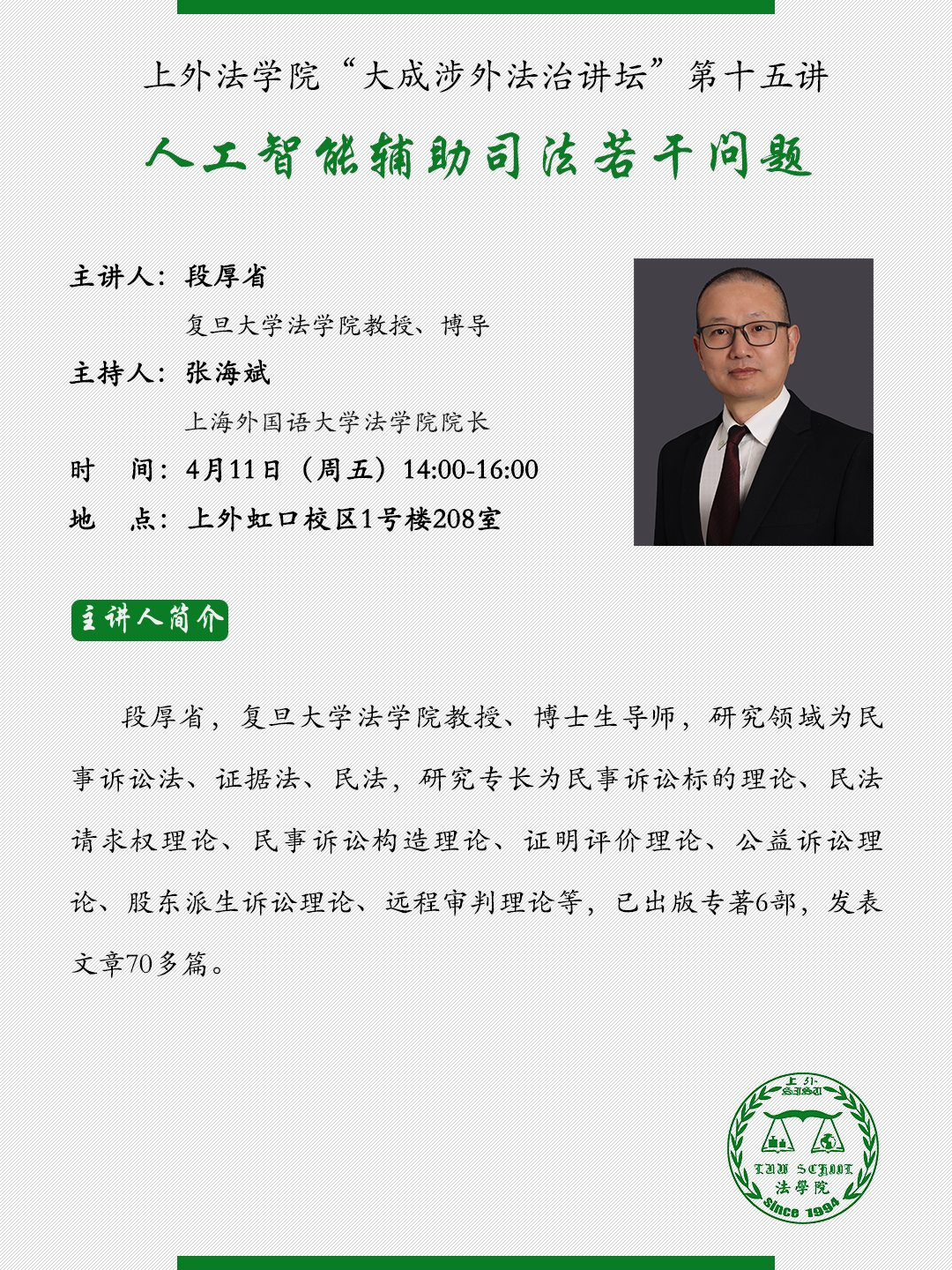 4月11日开讲 | 上外法学院“大成涉外法治讲坛”第十五讲:人工智能辅助司法若干问题