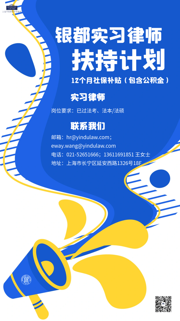 【岗位2】实习律师/实习生 (社保补贴) 【工作地点】上海市 【薪酬范围】面议 【岗位要求】 1.党员优先; 2.已通过法律职业资格考试,法学理论基础扎实,具备良好的英语听说读写能力; 3.全日制在校法学本科或硕士研究生,就读于国内外知名法学院校者优先,应届毕业生优先; 4.具有国内外大型律师事务所实习经验者优先; 5.积极主动,既能够独立工作,又能够融入团队行动; 6.作风严谨、品行端正,自觉恪守职业道德和执业纪律,有职业荣誉感; 7.热衷律师事业,勤奋踏实,有强烈的职业发展进取心,有团队合作精神,认同律师事务所的管理模式和企业文化。 【我们提供】 1.12个月社保补贴(包含公积金); 2.发放实习补助,具体面议; 3.考核合格者,有留用机会; 4.资深律师提供专业指导; 5.定期举办培训和研讨会。 简历请发送至:hr@yindulaw.com;eway.wang@yindulaw.com。