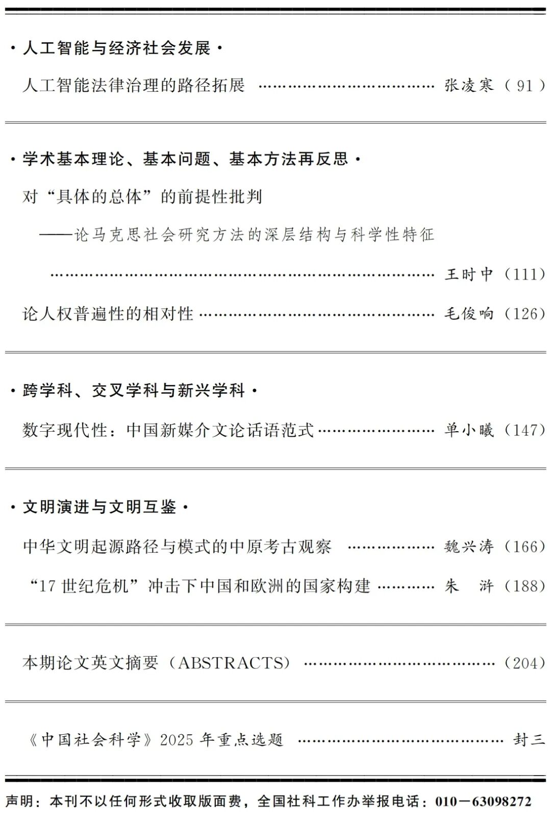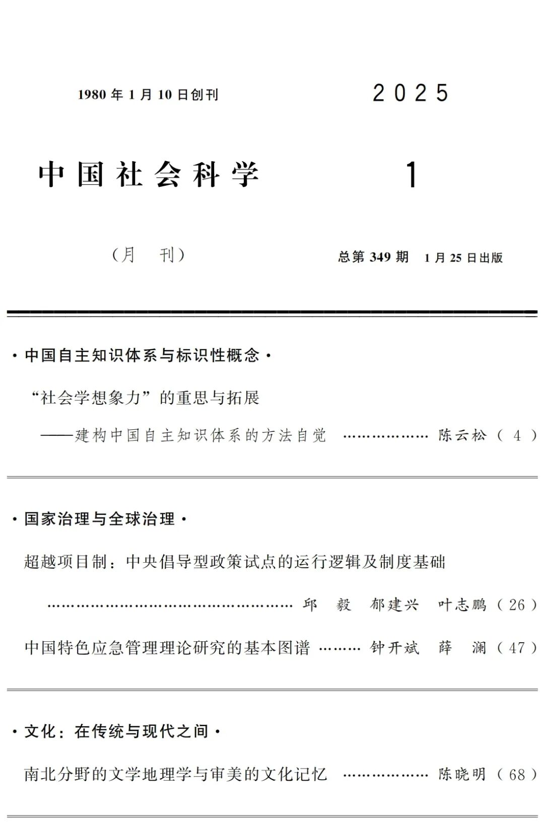 “社会学想象力”的重思与拓展——建构中国自主知识体系的方法自觉 摘要:建构中国自主社会学知识体系需要消弭“身土张力”:问题被议题悬置、本土被域外遮蔽、历史被边界断裂。知识体系和时空系统间的张力在全球社会学发展史上并非孤例,消弭这种张力呼唤“社会学想象力”的重思与拓展。中国哲学社会科学研究所期待的社会学想象力是一种更具文化主体性和社会实践性的心智品质,是文化自觉引领下的“知识相变”能力,强调问题意识、本土意识、根脉意识、方法意识和导向意识的统一。除了米尔斯所呼吁的把个人困扰和历史经验转化为社会公共议题外,中国社会学人应致力于以问题观照打破议题设置、以标识性概念重构知识版图、以历史根脉再造大国思维、以数据田野催生复杂理论、以实践导向组织探索方向。社会学想象力的重思与拓展亦是建构中国自主知识体系的方法自觉。 关键词:社会学想象力 自主知识体系 身土张力 方法自觉 作者陈云松,南京大学社会学院教授(南京210023)。 超越项目制:中央倡导型政策试点的运行逻辑及制度基础 摘要:党的十八大以来,中央不断完善现代财政体制并严格控制专项转移支付项目,以专项财政资金纵向配置为核心的项目制受到限制。在直接预算分配权受到约束的背景下,商务部等中央部门积极探索出一种不同于项目制的倡导型政策试点模式。该模式通过跨层级条块动员、全过程试点督导、诱致型创新支持等治理机制,成功解决地方试点激励不足、中央和地方试点信息不对称及试点创新能力不足问题,推动跨层级协同治理并顺利完成试点任务。倡导制对项目制的超越,是党的十八大以来国家治理模式重塑的结果,其最终成型,离不开中央有效调动地方政府与市场主体的积极性,实现“有效市场和有为政府”相结合。未来,中央倡导型试点或将与项目制并列共存、混合使用,并形成“中央倡导+省市项目制+基层治理”的纵向府际分工新形态。 关键词:政策试点 倡导制 项目制 预算分配权 跨层级协同治理 作者邱毅,浙江工商大学工商管理学院教授(杭州310018);郁建兴,浙江大学公共管理学院教授(杭州310058);叶志鹏,华东师范大学公共管理学院副教授(上海200062)。 中国特色应急管理理论研究的基本图谱 摘要:伴随实践发展和理论研究推进,应急管理已经成为中国公共管理研究的重点领域。中国现有的应急管理研究还比较零散,尚未形成清晰完整的总体图景,不利于理论研究的持续深入和学科的稳定发展。以“事件特征—管理体系—时空环境”的综合分析框架,从突发事件的发生规律和演化特征、应对突发事件的管理体系以及突发事件应对活动所处的时空环境三个层次,可以勾勒中国特色应急管理理论研究的基本图谱,探寻未来中国特色应急管理理论研究的重点领域和优先发展主题。中国特色应急管理理论研究主要包括基于中国情境的突发事件演化机理、基于党政统领的应急管理体制、基于全生命周期的应急管理过程、基于刚柔相济的应急管理制度、基于优势互补的应急管理工具、基于宏观影响的应急管理环境共6个重点领域、21个优先发展主题。 关键词:应急管理 研究图谱 知识体系 学科建设 中国情境 作者钟开斌,中共中央党校(国家行政学院)应急管理研究院教授(北京100089);薛澜,清华大学公共管理学院教授(北京100084)。 南北分野的文学地理学与审美的文化记忆 摘要:南北分野之说乃是中国传统深层的、顽强的文化记忆,它建构起有效的地理叙事范畴,构成中国古典乃至现代经典性的文学理论范式。南北分野的文学地理学范式一直隐含在中国文学从古至今的发展脉络中,它不只表明中国文学有着异常顽强的传统延续性,同时也表明中国文学与西方文学有着非常不同的审美构成和价值取向。地理空间性是我们的想象的建构,但它确实又有传统性的积淀,有着深挚的文化记忆,现代性的建构和当代性的冲动与之共同生成南北分野之说的合理性依据。当前文学创作与研究中关于“新南方写作”的想象,再次强化了当代文学试图通过地理学路径打开未来面向的企图。新的写作源自农耕文明的地气,这是它的本分,也是它的命运。它离世界文学只有一步之遥,但中间横亘着的依旧是中国的山川大地。 关键词:文学地理学 南北分野 文化记忆 风格学 新南方写作 作者陈晓明,北京大学中文系教授(北京100871)。 人工智能法律治理的路径拓展 摘要:人工智能的法律治理正处在规则形成期。基于风险的法律治理路径的“简单化”与人工智能法律治理需求“复杂化”存在矛盾,我国既有立法实践进行的本土化改良仍无法克服其固有局限。随着我国人工智能法律治理进入系统集成阶段,围绕实现人工智能高质量发展和高水平安全良性互动的治理主旨,要引入适应性治理理念统筹安全发展,应对人工智能多重属性构成复杂系统的治理需求,并高度容纳技术发展的不确定性和未知前景。在此基础上构建具有适应性的人工智能法律治理框架、方案、工具,拓展形成符合我国本土制度环境、技术产业基础与发展目标的法律治理路径。 关键词:人工智能立法 人工智能风险 分级分类 关键人工智能 适应性治理 作者张凌寒,中国政法大学数据法治研究院教授(北京100083)。 对“具体的总体”的前提性批判——论马克思社会研究方